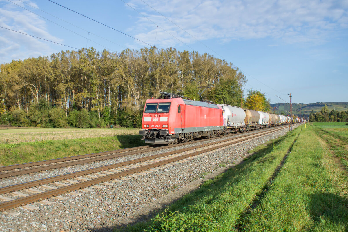 185 032-0 mit einem gemischten Güterzug bei Retzbach-Z. am 16.10.2024.
