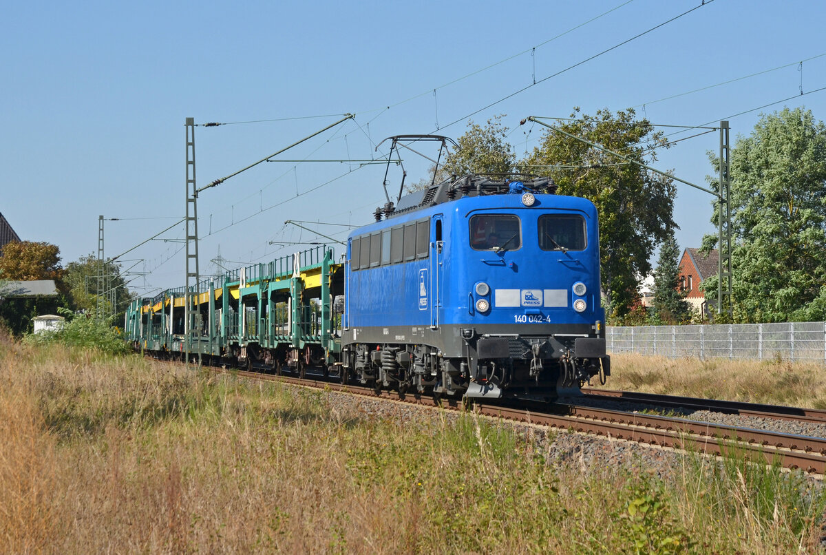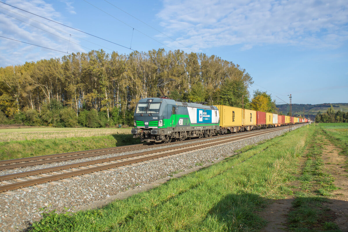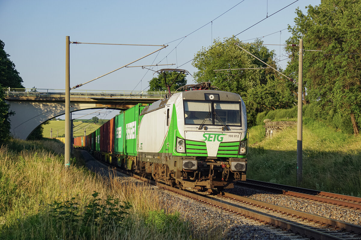 SETG 193 812 mit einem Containerzug nach Hof am 19.09.2023 bei Neumark.