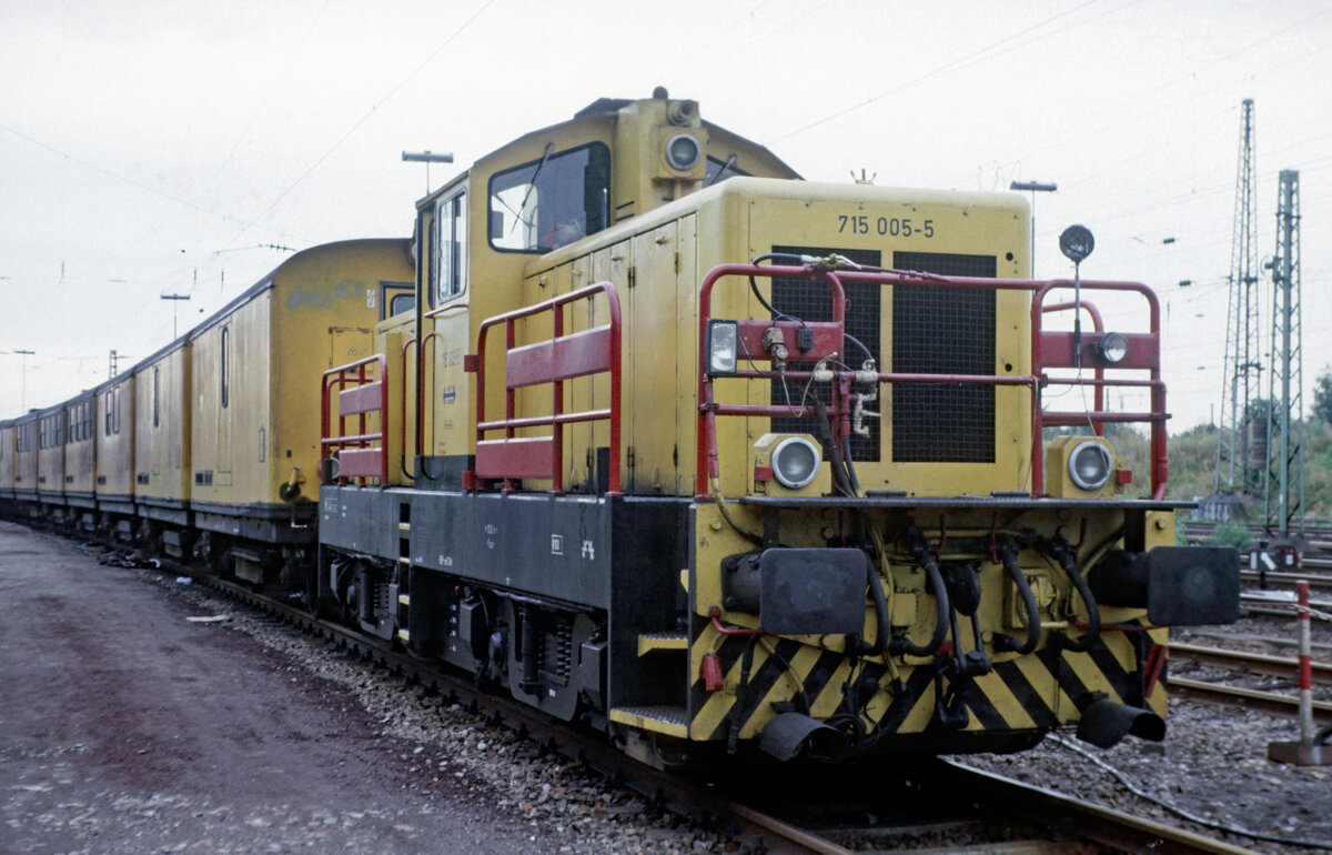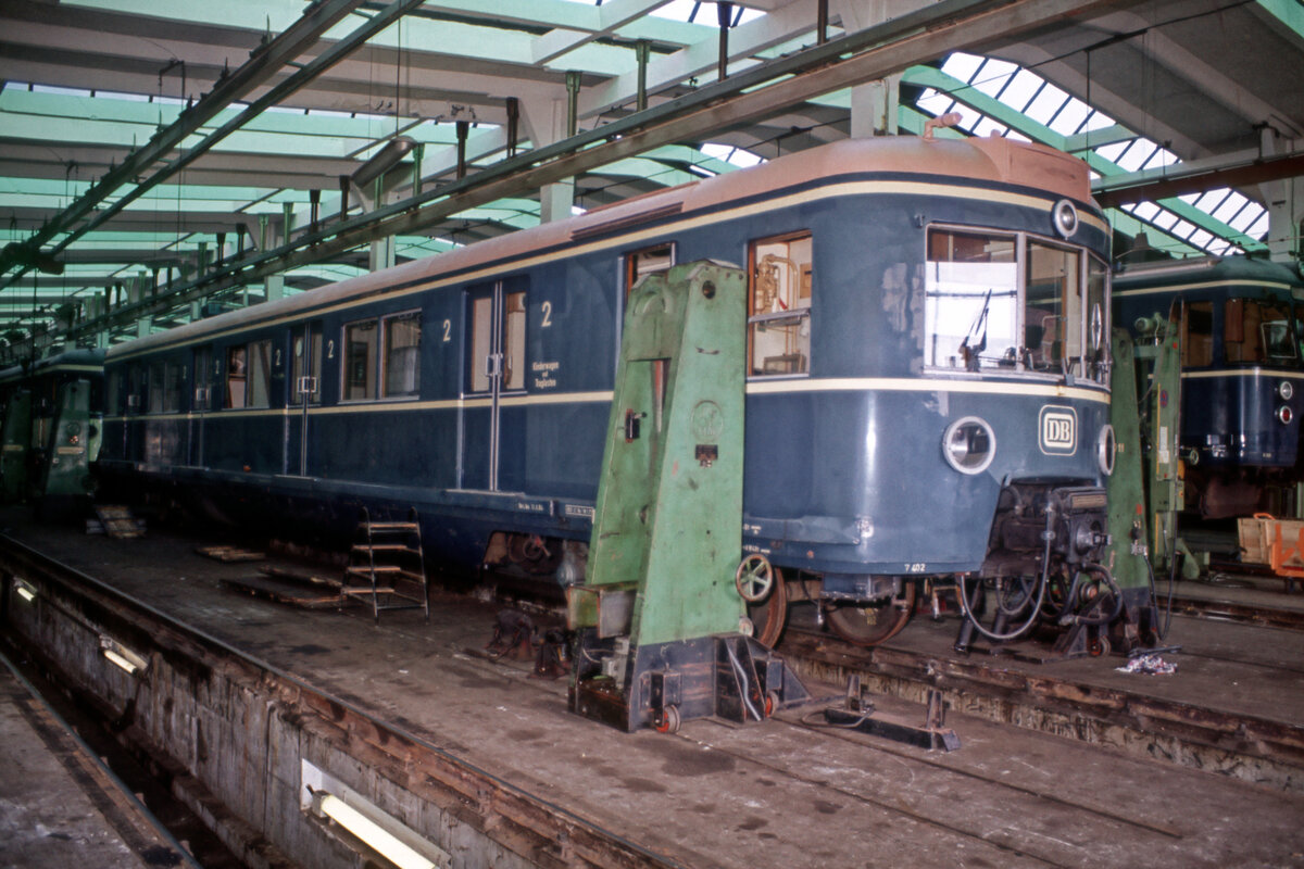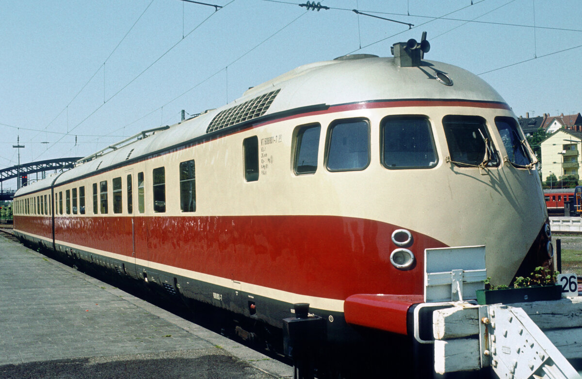 1980 war das Fotografieren des 608 801 im Bereich der US-Army in Heidelberg noch leichter möglich. Die Aufnahme zeigt den VT vor dem großen Umbau, erkennbar u. a. am geteilten Stirnfenster, dem dritten Stirnlicht über dem Fenster und nur einem Seitenfenster.