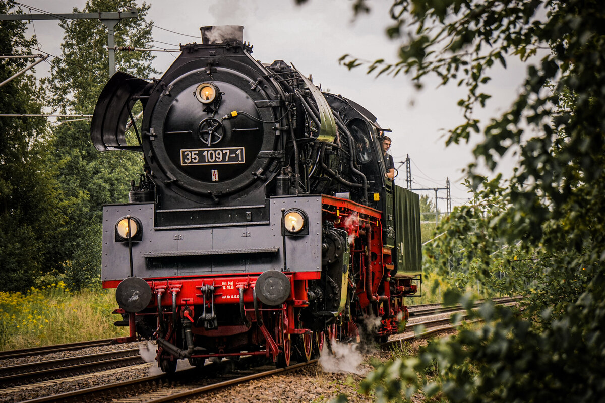 35 1097 der Eisenbahnfreunde aus Glauchau übernahm am 26.08.2023 die Führerstandsmitfahrten beim 30. Heizhausfest des Sächsischen Eisenbahnmuseum Chemnitz Hilbersdorf. Hier war sie gerade mit einer der vielen Hin- und Herfahrten auf dem Museumsgleis unterwegs.