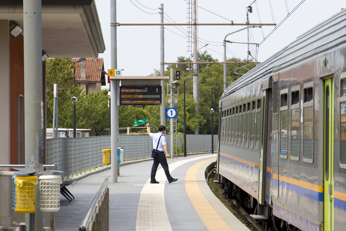 Am 8. Juli 2024 war der Fahrgastwechsel beim Regionale Veloce 3440 (Trieste c.le - Venezia S. Lucia) am Bahnhof Monfalcone beendet und der Zugbegleiter (capotreno) signalisiert soeben den Auftrag zur Abfahrt.