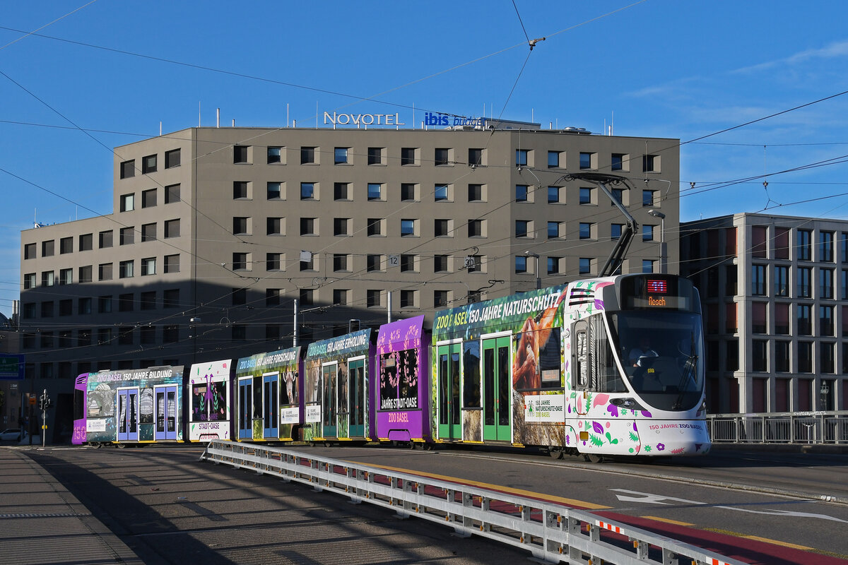 Be 6/10 Tango 158 mit der Werbung für 150 Jahre ZOO Basel, auf der Linie 11, überquert am 07.09.2024 die Münchensteinerbrücke. Aufnahme Basel.