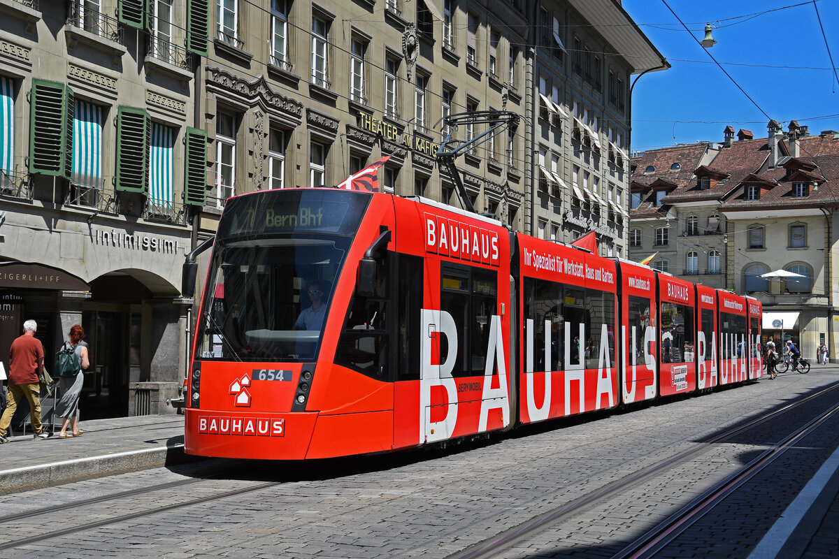 Be 6/8 Combino 654 mit der Bauhaus Werbung, auf der Linie 7, bedient am 09.07.2024 die Haltestelle Bärenplatz. Aufnahme Bern.