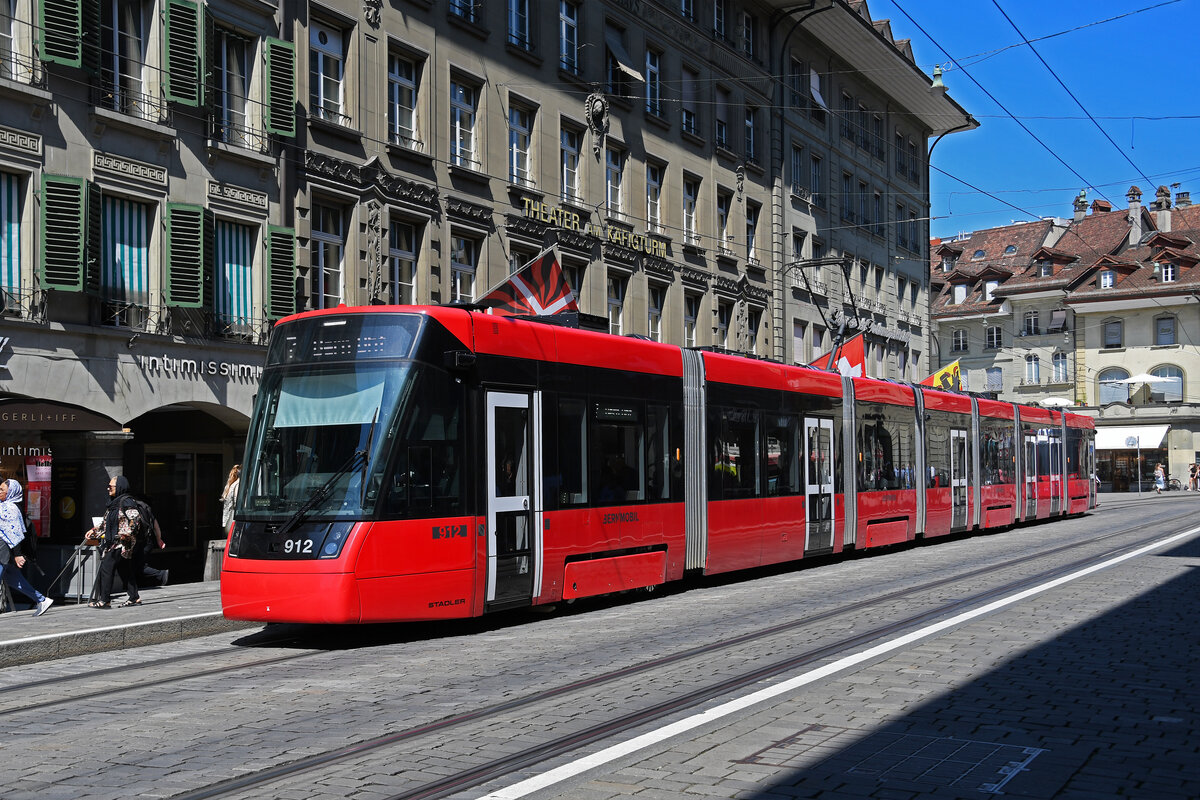 Be 6/8 Tramlink 912, auf der Linie 7, bedient am 09.07.2024 die Haltestelle Bärenplatz. Aufnahme Bern.