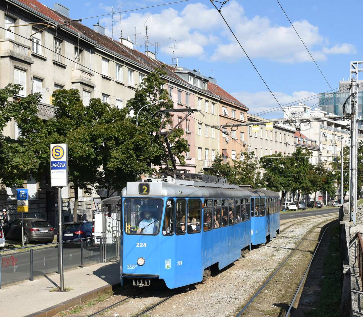 Der TMK 201 Triebwagen 224 sowie der Beiwagen 712 fuhren am Abend des 6. Septembers 2023 auf der Linie 2 von Savišće nach Črnomerec, und wurden dabei von mir in der Halstestelle Jagićeva fotografiert.
