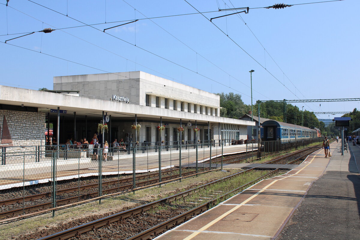Die Bahnsteige und das sehr gepflegte Empfangsgebäude in Keszthely am 19.07.2024.