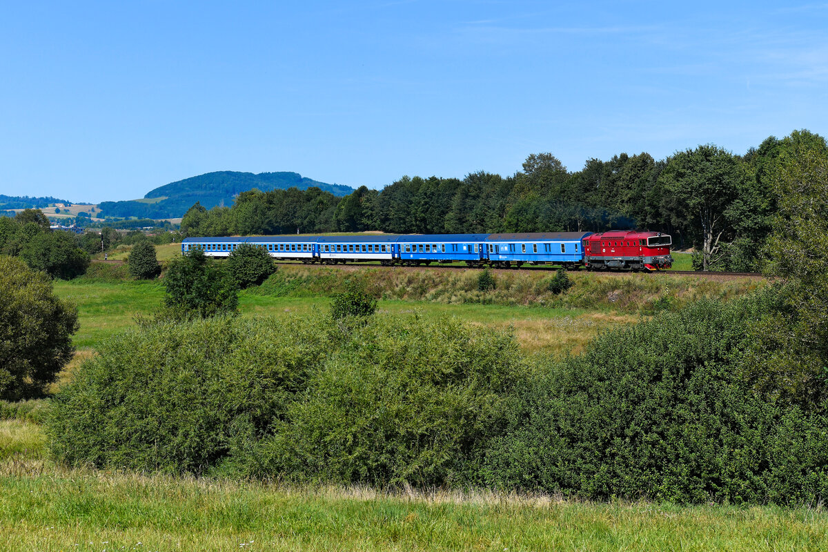 Am 9. Juli 2024 war SŽ 644 020 zur Führung der "Autozüge" auf der Wocheinerbahn eingeteilt. Hier passiert sie mit dem AVT 854 (Most na Soči - Bohinjska Bistrica) den Bahnhof Grahovo.