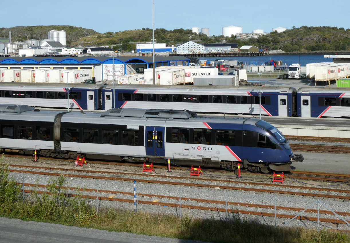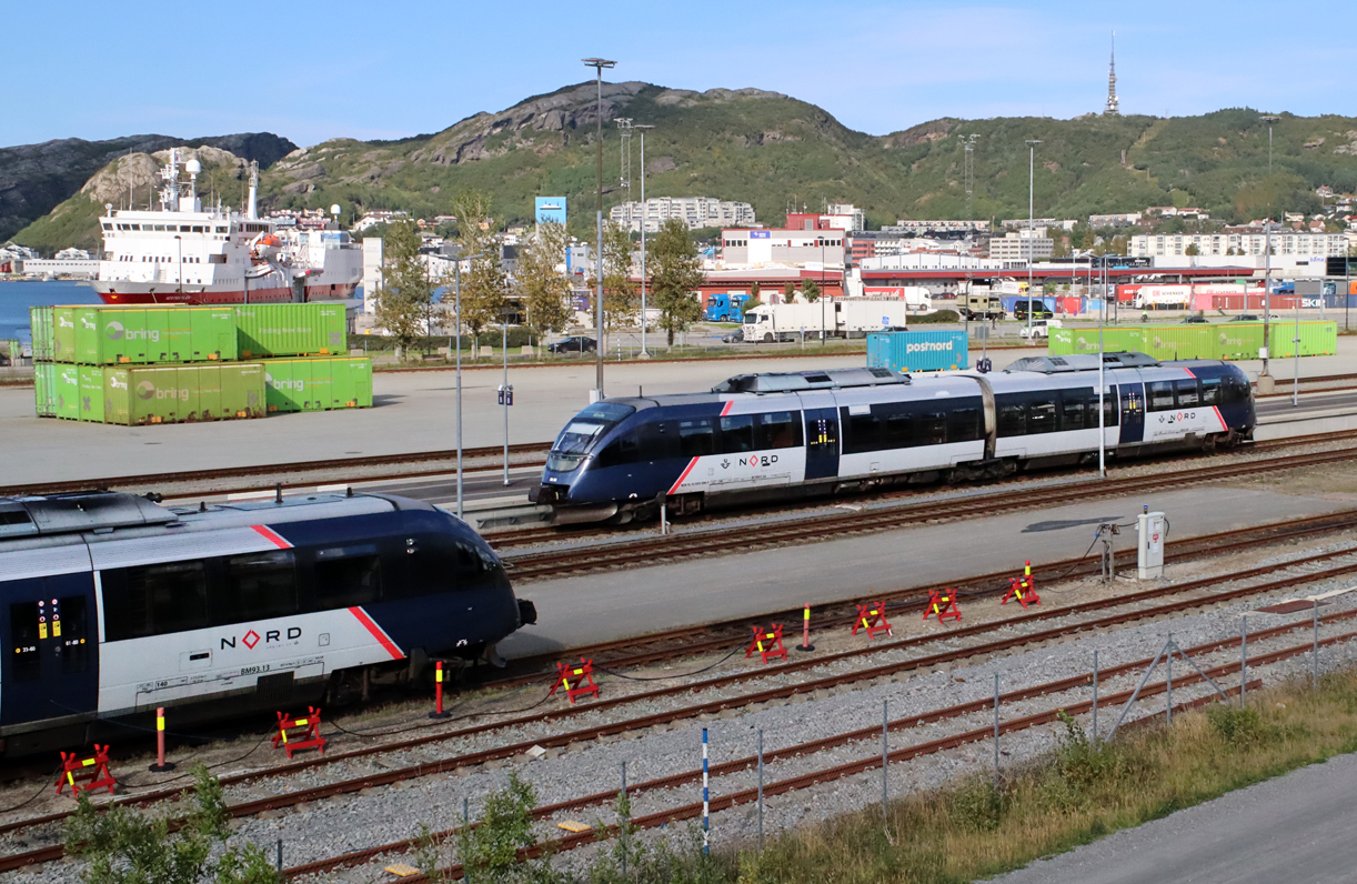 Talent-Triebzug Serie 93 fährt in Bodö ein, währenddem im Vordergrund ein weiterer solcher Triebzug auf seinen Einsatz wartet und im Hintergrund das Hurtigrutenschiff auf der Nordroute im Hafen sichtbar ist. Bodö, 22.8.2024