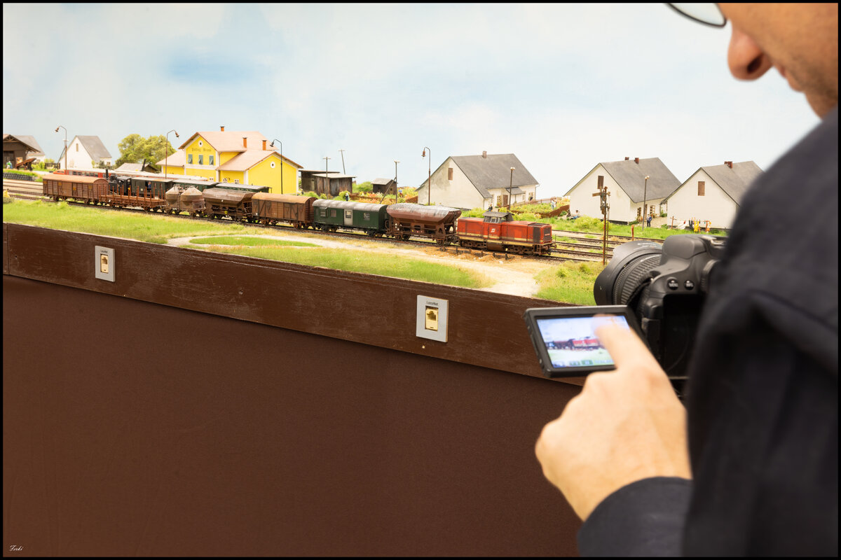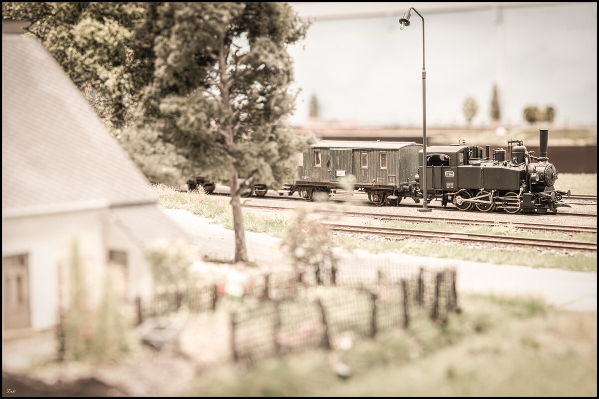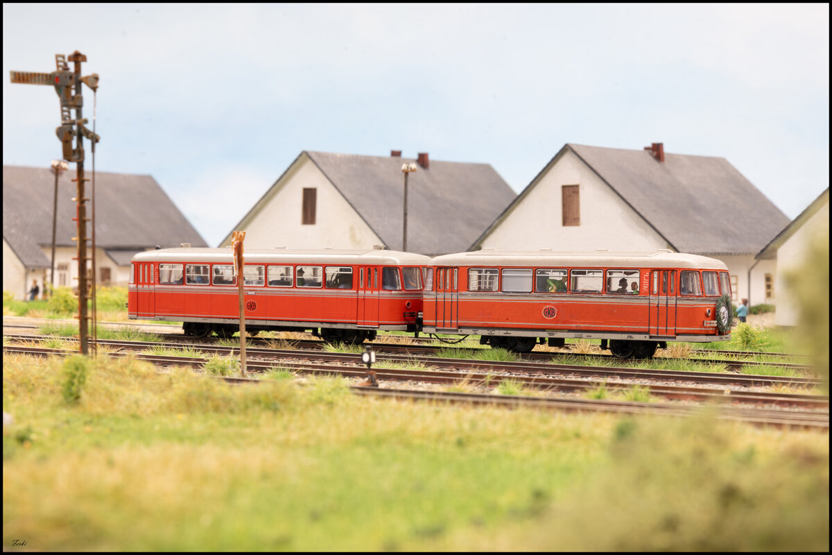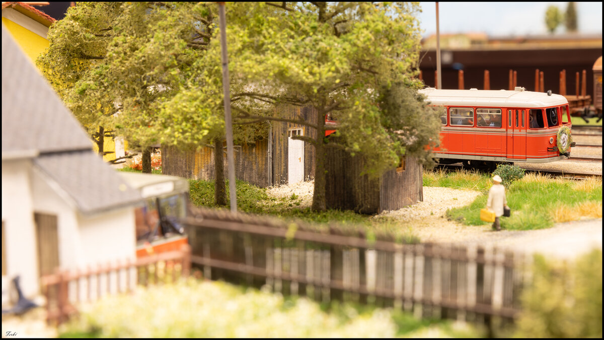 Ein Blick durch die Gärten meiner Heimat. Der legendäre Rote Blitz wartet auf die Abfahrt im Modellbahnhof Pöfing Brunn auf der Anlage der Freunde der Sulmtalbahn 11.Oktober 2024