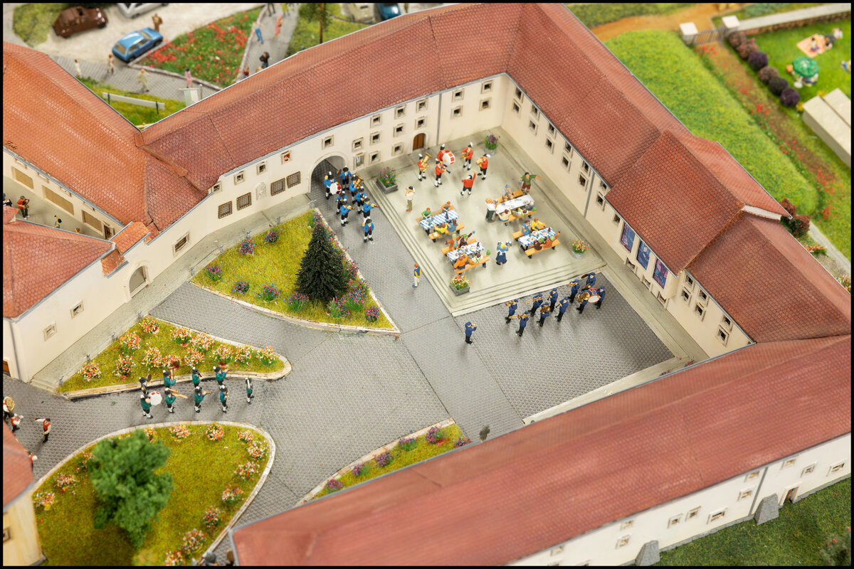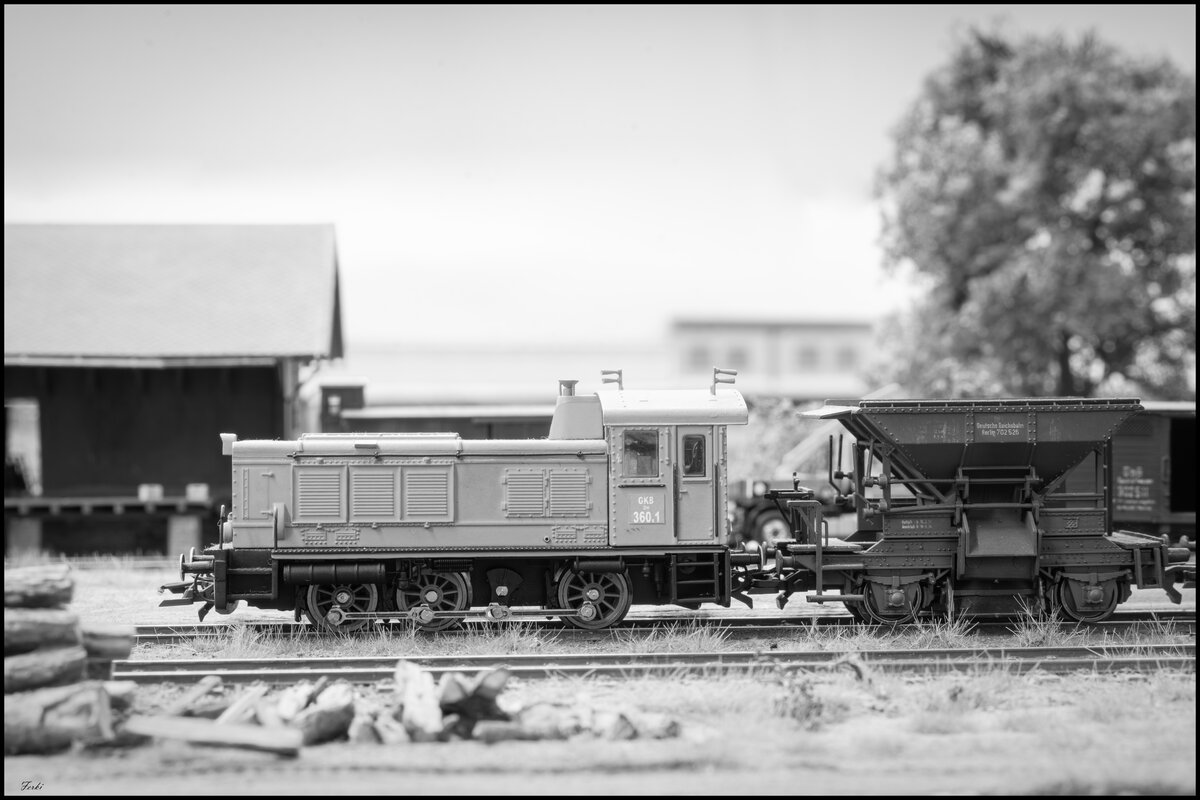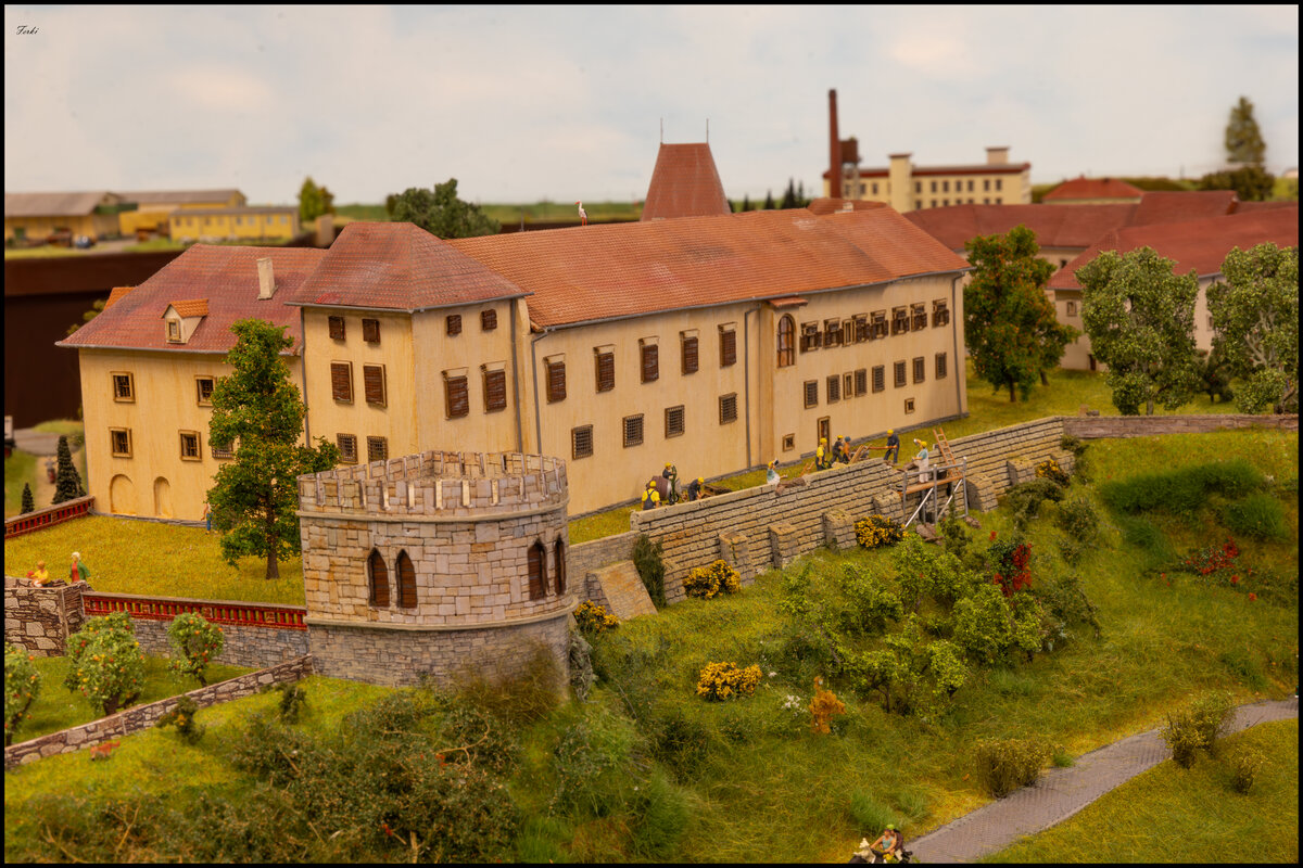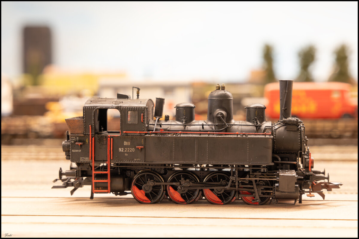 Ein Blick durch die Gärten meiner Heimat. Der legendäre Rote Blitz wartet auf die Abfahrt im Modellbahnhof Pöfing Brunn auf der Anlage der Freunde der Sulmtalbahn 11.Oktober 2024