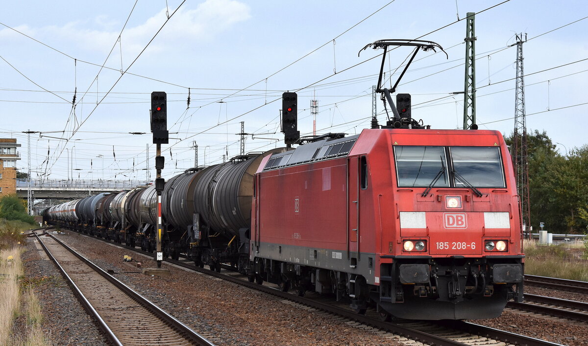 DB Cargo AG, Mainz mit ihrer  185 208-6  [NVR-Nummer: 91 80 6185 208-6 D-DB] und einem gemischten Kesselwagenzug Richtung Rbf. Seddin am 14.10.24 Höhe Bahnhof Schönefeld b. Berlin.