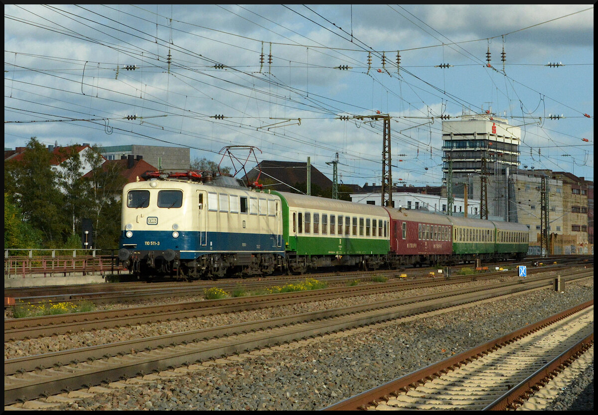 Ein Gruß aus den 1980ern: Fast wie damals kam am 13.10.2024 die ozeanblau/beige Kasten 10er der PRESS (110 511-3) mit dem DZ 1821 Rosenheim - Zwickau/Sachs auf der Siebenbogenbrücke in Fürth/Bay. um die Kurve. Die Szenerie erinnert ein wenig an die Zeiten der "Interzonenzüge", als in solchen Konstellationen, DB Lok und DR Wagen, Schnellzüge zwischen Ost- und Westdeutschland verkehrten.