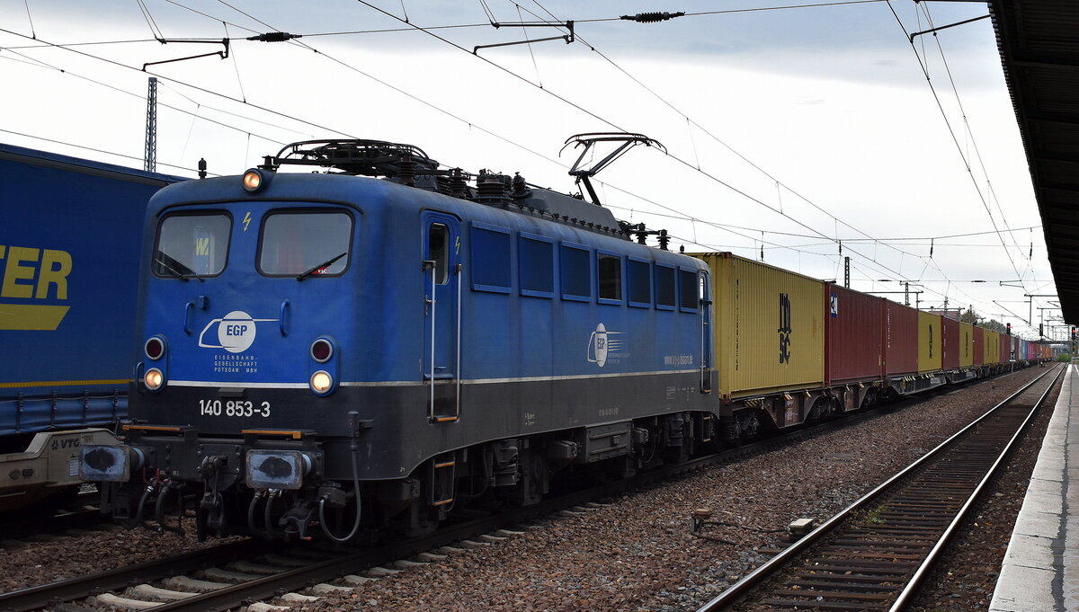 Eisenbahngesellschaft Potsdam mbH, Potsdam (EGP) mit ihrer  140 853-3  (NVR:  91 80 6140 853-3 D-EGP ) und einem Containerzug am 14.10.24 Höhe Bahnhof Schönefeld b. Berlin.