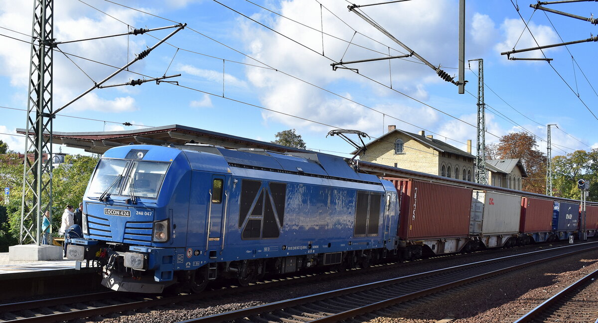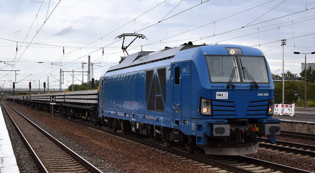 SKL Schienen Komplex Logistik Magdeburg GmbH & Co. KG, Magdeburg [D] mit der Vectron Dual Lok  248 049  [NVR-Nummer: 90 80 2248 049-9 D-NRAIL] mit einem Ganzzug Drehgestellwagen für Oberbaustoffe (DB Bahnbau Gruppe) mit Betonbahnschwellen am 14.10.24 Höhe Bahnhof Schönefeld b. Berlin.