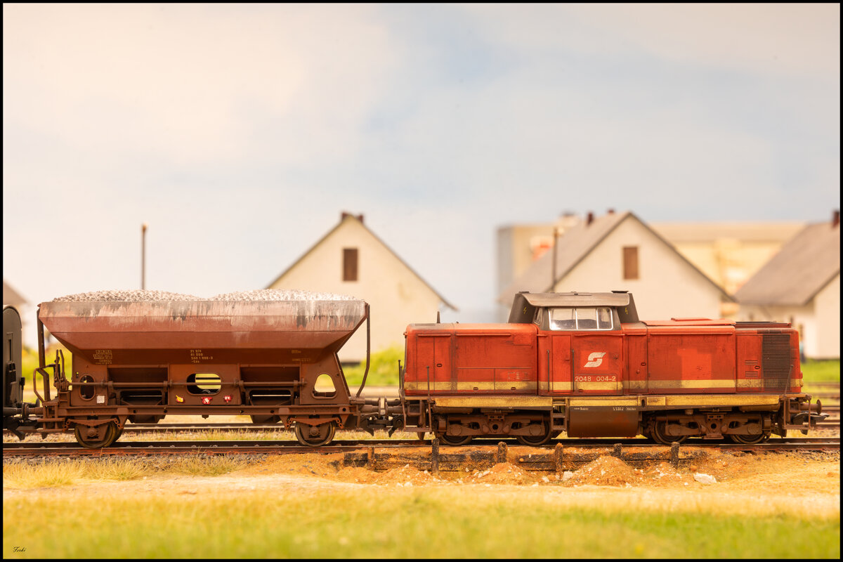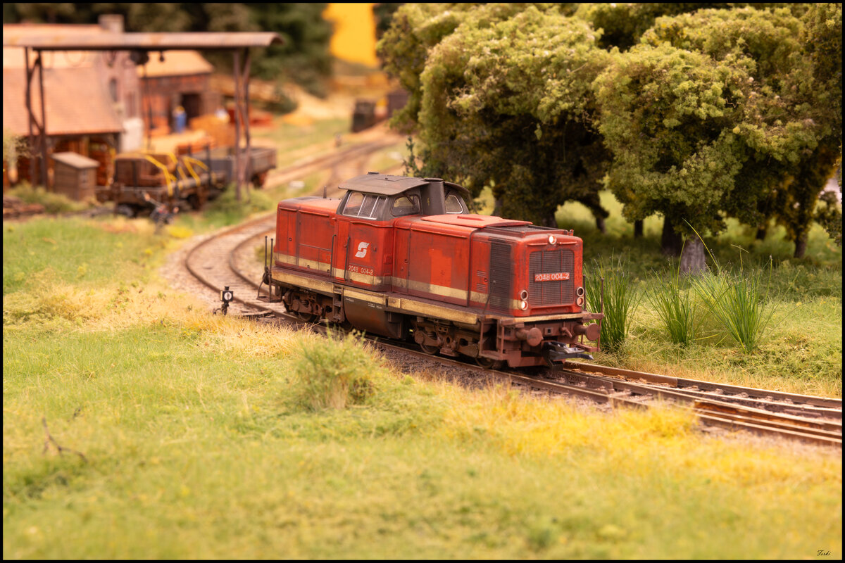 Vor Ihrem Güterzug wartet 2048.004 auf Ihre Abfahrt aus dem Bahnhof Pölfing Brunn . Zu Gast auf der Modulanlage der Freunde der Sulmtalbahn. 11.10.2024