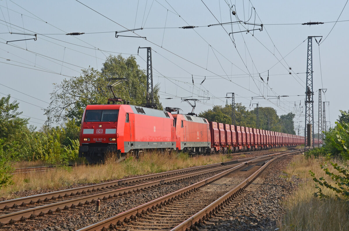 Zusammen mit 152 048 erreicht 152 167 mit einem leeren Erzzug aus Ziltendorf am 18.09.24 den Bahnhof Saarmund. Auch hier dauerte es eine Stunde bis er seine Fahrt nach einem Personalwechsel fortsetzen konnte.