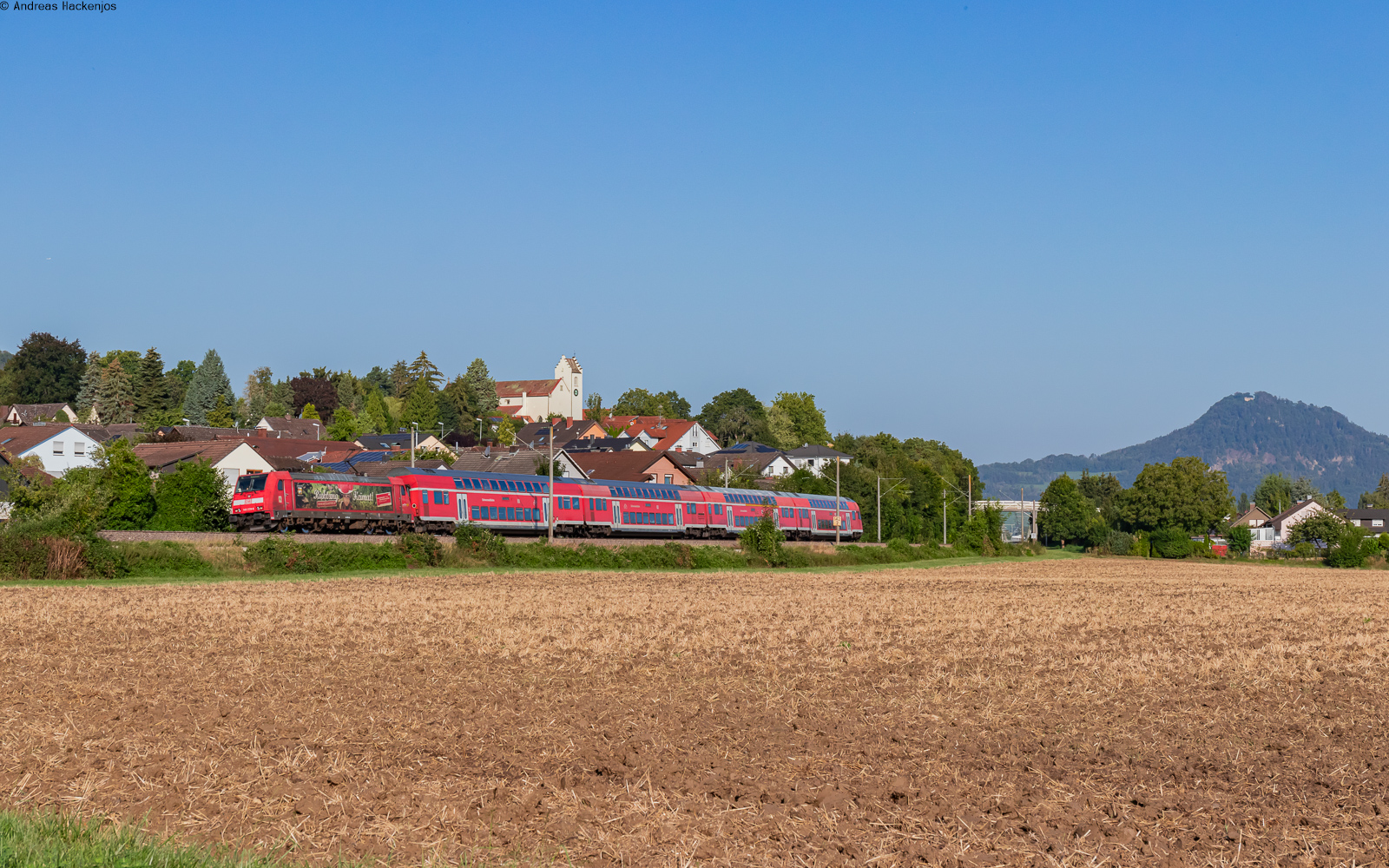 Alles doppelt! Zwei 111er (087-3 & 076-6) parkten am 14.10.2024 im Bahnhof Treuchtlingen mit ihren Doppelstockzügen so nebeneinander, dass diese Aufnahme möglich wurde. Außer ihnen sind auch noch zwei Gleise, zwei Masten, zwei Bahnhofsnamen und im Hintergrund zwei rote Schiebeplanenwagen im Bild zusehen.