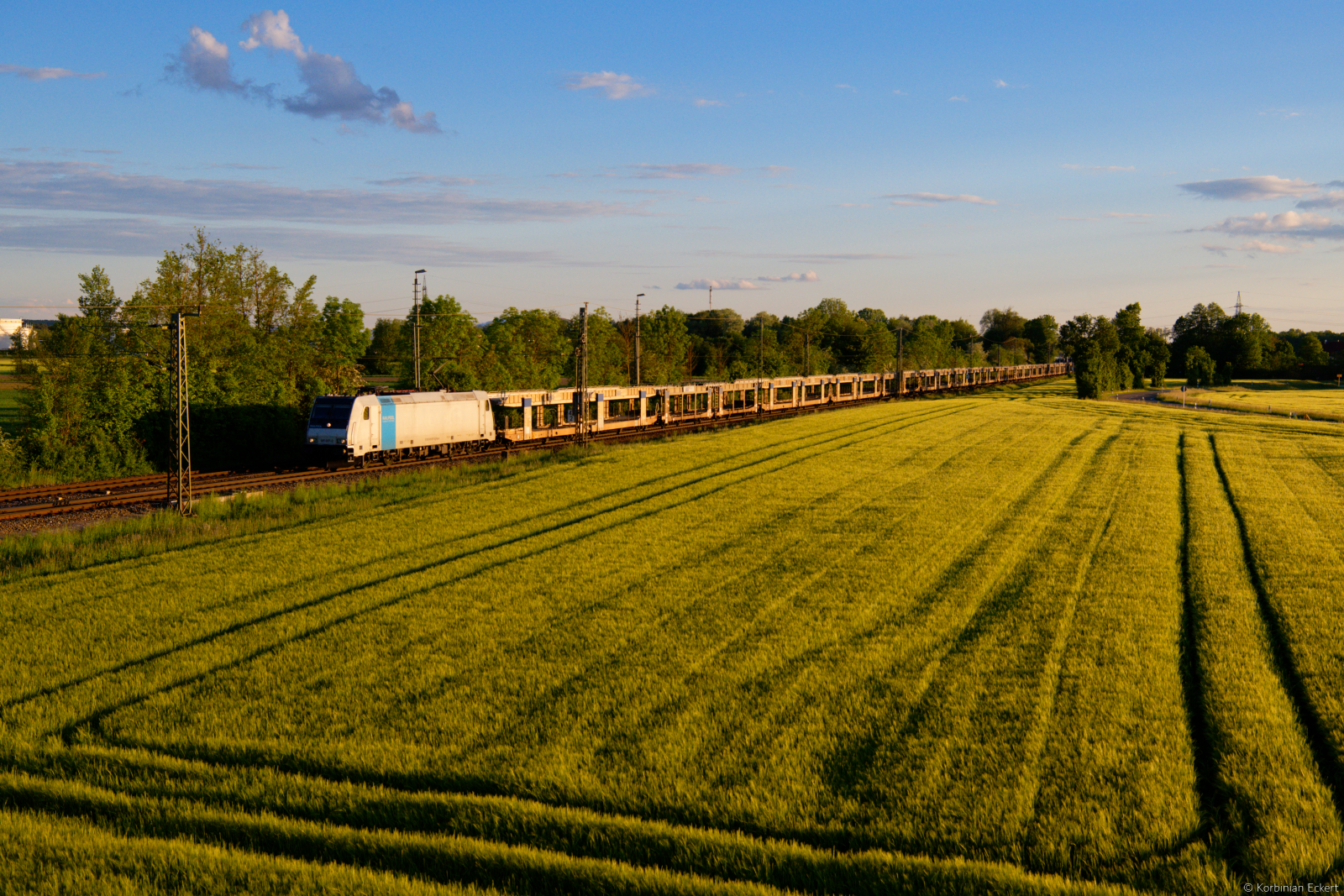 Vor der Kulisse der Bayernoil Raffinerie passiert 185 697 Railpool mit einem BLG-Autotransportzug Neustadt (Donau) in Richtung Regensburg , 29.05.2021