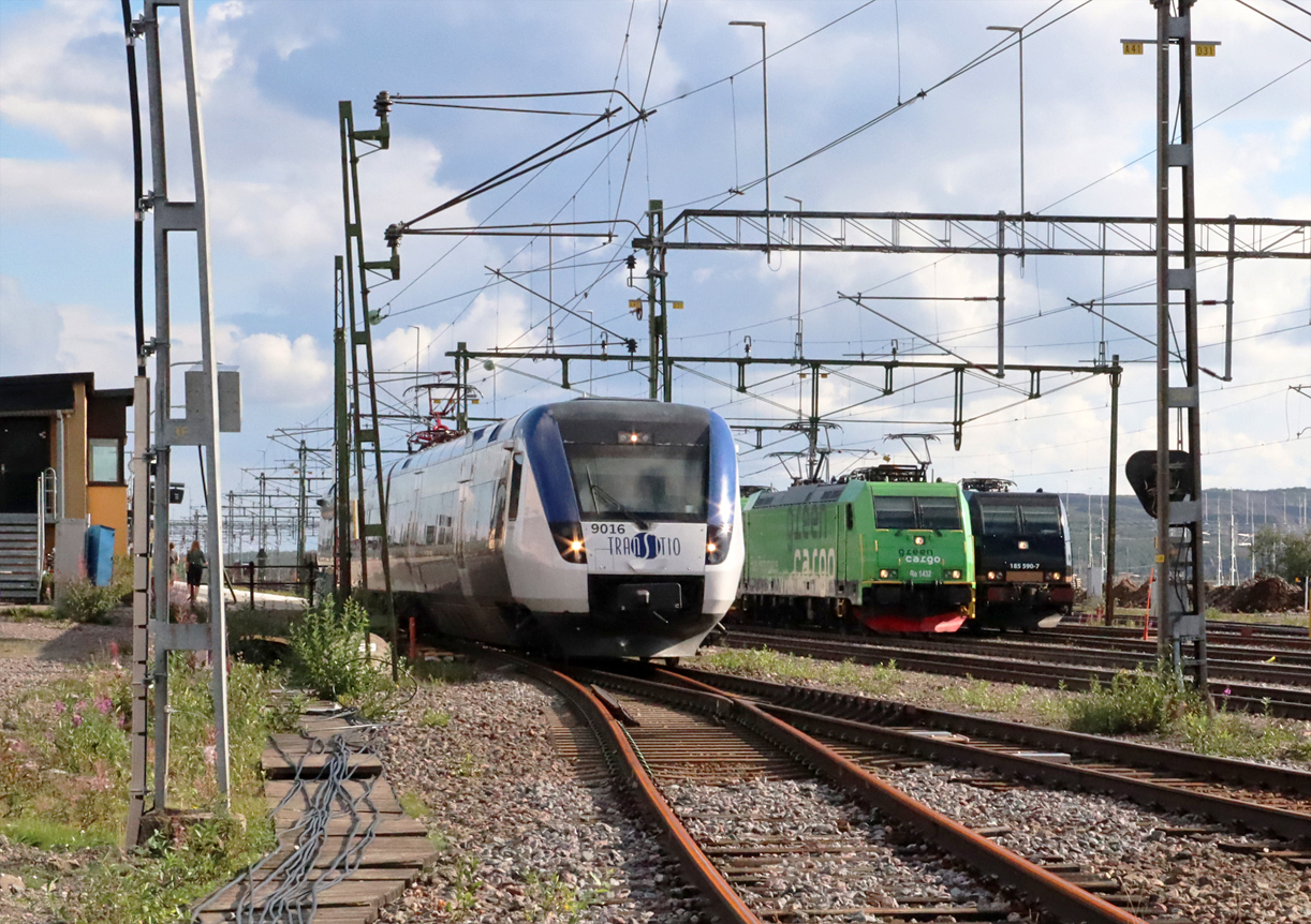 Zwei Güterzüge warten in der Nachmittagssonne in Kiruna auf die Abfahrt. Kiruna, 12.8.2024