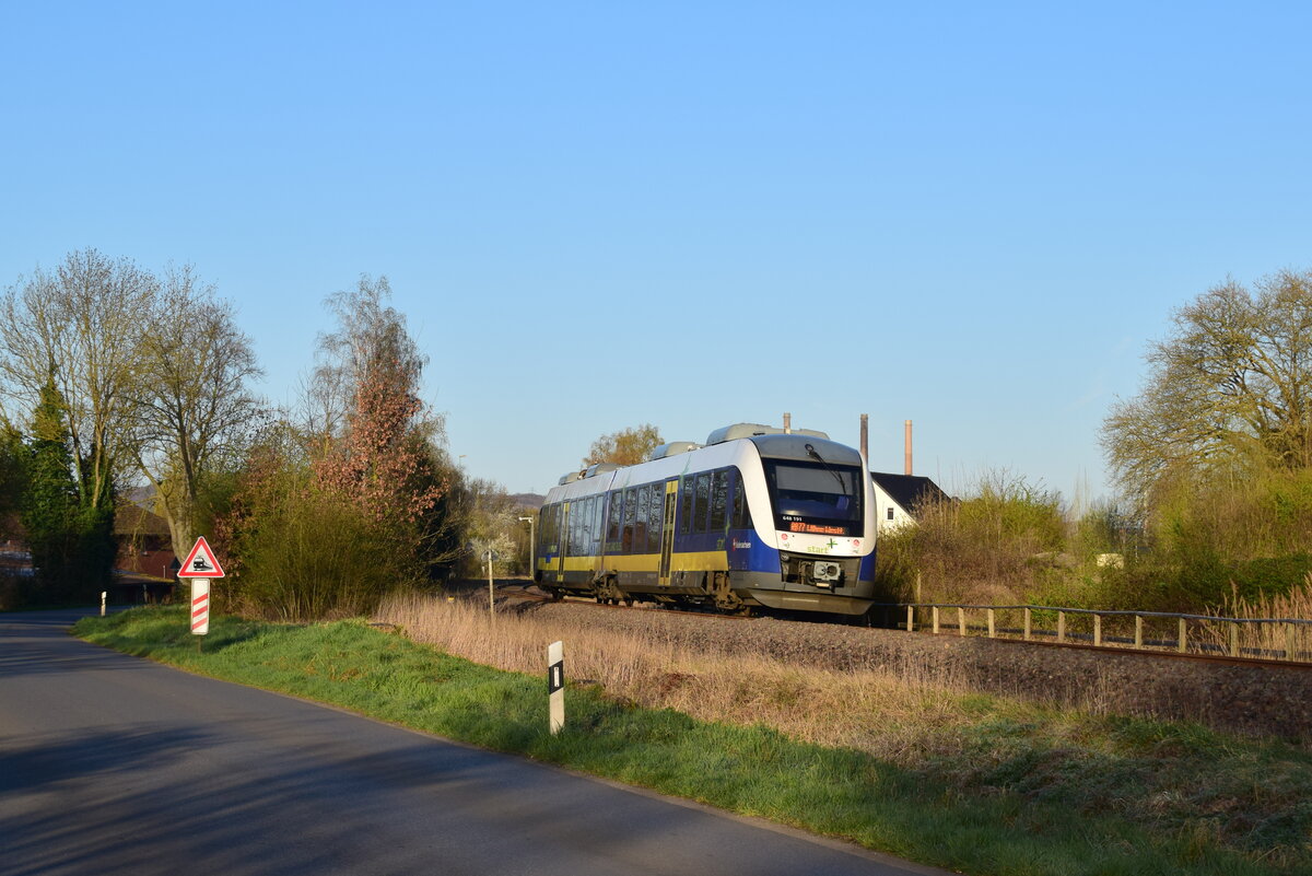 648 189 hat soeben den Bahnübergang Berliner Straße bei Westendorf passiert und ist auf den Weg von Hessisch Oldendorf nach Rinteln. Das Bild wurde von einem Bahnübergang aus gemacht welcher modernisiert auf ein Gleis eingekürzt wurde was dieses Motiv ermöglichte.