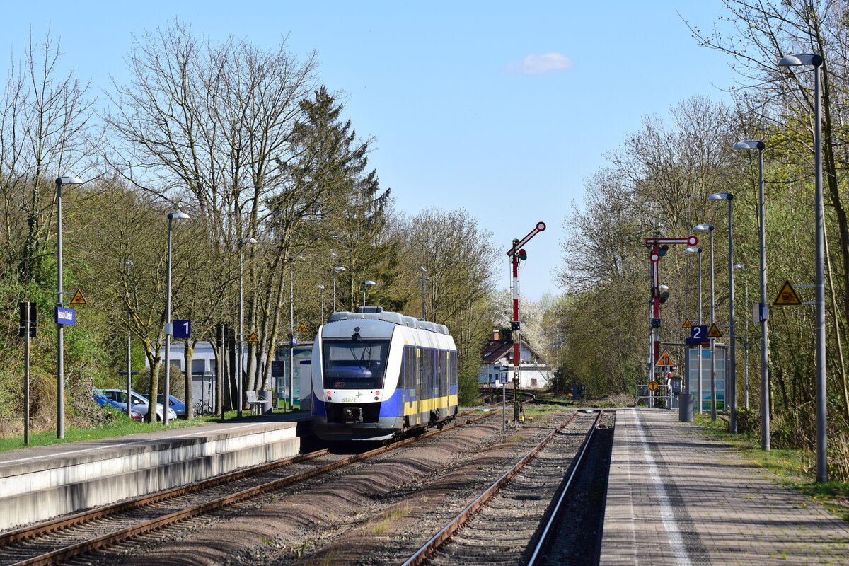 Da Realsolt ist im Ermerbogen bereits abgeblüht in den sich der GTW 2/8 am 23.4.2025 legt.