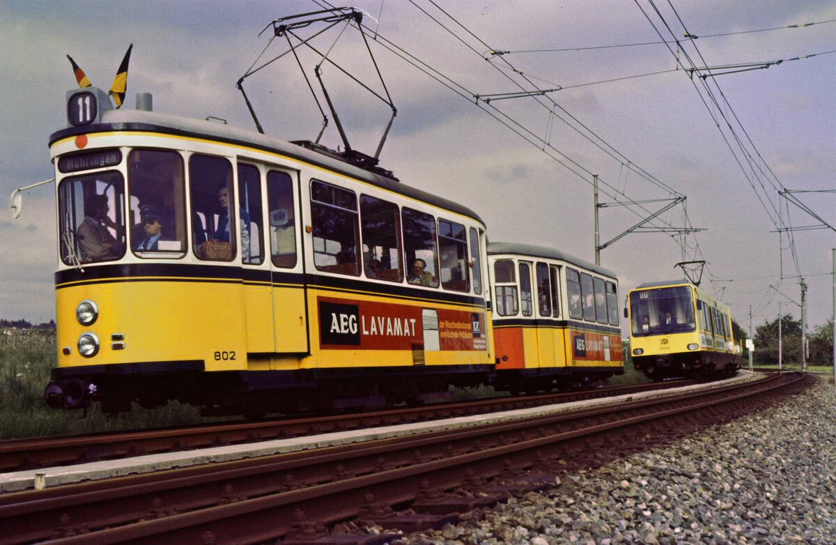 Ein glücklicher Tag für alle Stuttgarter Straßenbahnfans: Am 31.05.1984 fanden auf der Stuttgarter Straßenbahnlinie 3 (Plieningen-Vaihingen) einige Sonderfahrten mit Museumsstraßenbahnen statt. TW 802 aus der Serie T2 (MF Esslingen) fährt auch immer noch auf Stuttgarter Gleisen (2025), nur eben leider nicht länger auf der Linie 3 (1000 mm Gleise wurden dort schon vor langer Zeit abgebaut). Auch der Beiwagen (Fuchs Typ B2) fährt noch auf Stuttgarter Straßenbahngleisen (bei der Straßenbahnwelt Stuttgart). Der Museumszug wird aber am 31.05.1984 leider schon von der Zukunft der Stuttgarter Linie 3 "bedroht": Die Zukunft ist ein MAN-Stadtbahnwagen der ersten Serie!