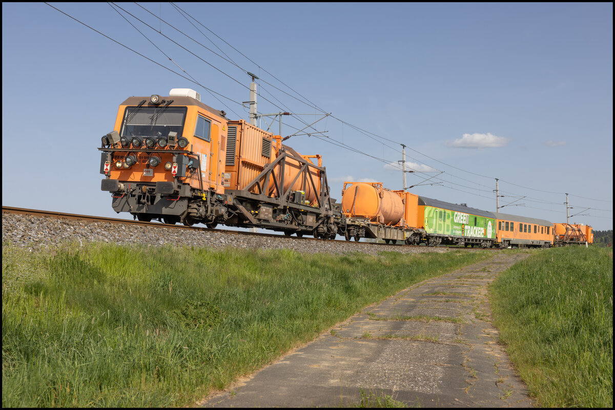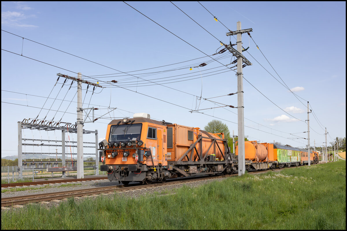 Im "Ermerbogen" legt sich der einstige "Cargosprinter" in den Bogen . Nach getaner Arbeit rollt der Vegetationskontrollzug zurück nach Graz zu seinem nächsten Einsatz. 23.4.2025