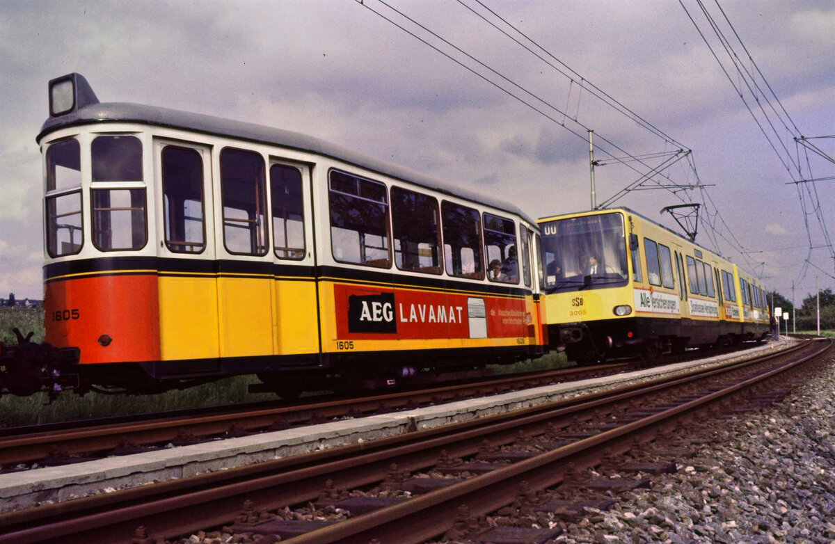 So viele Straßenbahnwagen (und auch Stadtbahnwagen der ersten Serie) fanden sich auf der Stuttgarter Straßenbahnlinie 3 (Plieningen-Vaihingen) wohl noch nie zuvor: Vorn ein Stuttgarter Beiwagen Typ B2, und dahinter schon die Zukunft, ein Stadtbahnwagen der ersten Serie, zwischen Plieningen und der Station Landhaus noch vor dem Waldstück auf den Gleisen der früheren Filderbahn (31.05.1984)