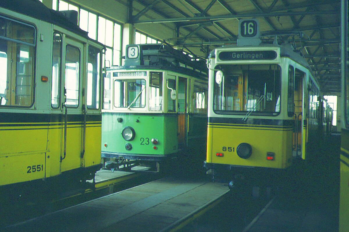 SSB Stuttgart_Straßenbahn-Betriebshöfe__Ostheim (Vh4)__ATw 2551 [ME 1952; ex 276; inzw. Museumswagen 276], der Reutlinger Tw 23 [HK 1913] und Gartenschau-Tw 851 [Uerdingen 1939; auch Museumswagen].__05-1974