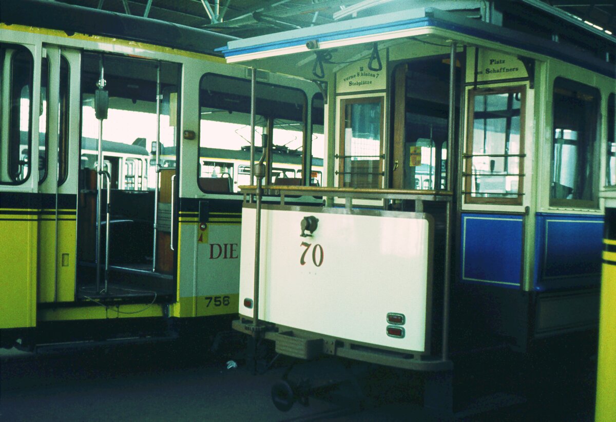 SSB Stuttgart_Straßenbahn-Betriebshöfe__Ostheim (Vh4)__Bw 22 der ehemaligen Esslinger Städt. Straßenbahn [ME 1919] seinerezeit in den Farben des Tw 222 von 1904 mit der Phantasie-Nr. 70 in der oberen Halle neben Tw 756.__05-1974