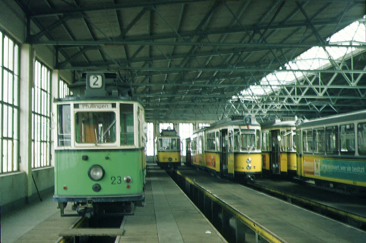 SSB Stuttgart_Straßenbahn-Betriebshöfe__Ostheim (Vh4)__Reutlinger Tw 23 [HK 1913], ATw 2529 [ex und späterer SSB Tw 418] und einige DoT4 mit Bw auf (der alten) Linie 2 in der oberen Halle. Die Linie 2, die nur noch in der HVZ zwischen Leipziger Platz und Ostendplatz verkehrte wurde keine 2 Monate nach dieser Aufnahme zum 18.05.1972 "vorübergehend eingestellt" und nicht wieder in Betrieb genommen._04-04-1972