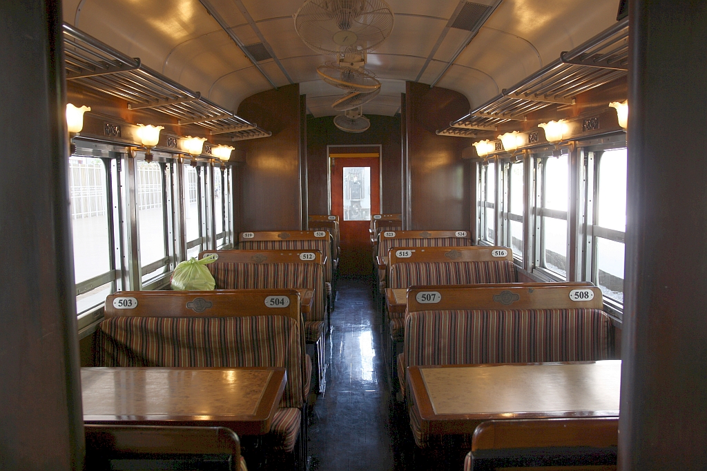 Für die Touristenzüge verwendet die JKNS eine 6-teilige Wagengarnitur, bestehend aus einem nummernlosem Küchenwagen und fünf historischen Reisezugwagen welche mit Nummer 1 bis 5 bezeichnet sind. - Im Bild vom 15.Februar 2025 eine Innenansicht des Wagen 5, eingereiht als letztes Fahrzeug des nur an Samstag verkehrenden Touristenzug "TRAIN TO MUARA SUNGAI BENONI" in der Stesen Tanjung Aru.