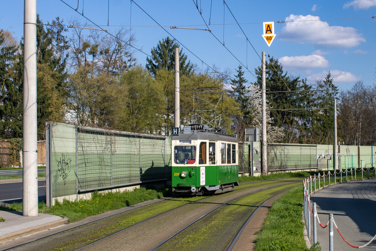 Graz. Als Sonderlinie "H4" erreicht der Oldtimer 206 hier am 04.04.2025 die Haltestelle Dr.-Lister-Gasse.