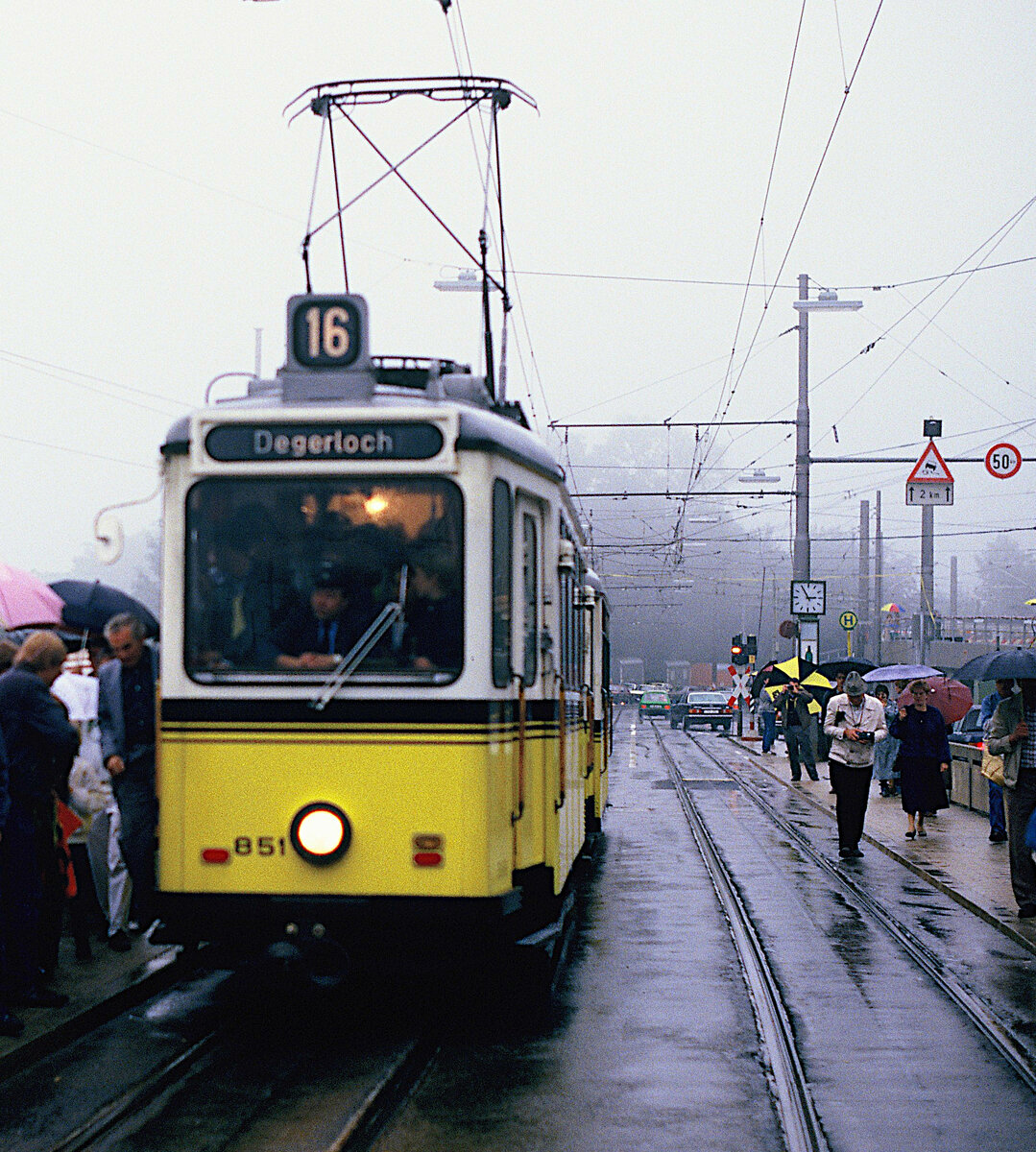 Letzte Sonderfahrt auf den Gleisen der Neuen Weinsteige (und das Wetter hätte sie beinahe nicht ermöglicht): Der übervolle TW 851 (Uerdingen) und BW 1390 waren gezwungen, ihre Fähigkeiten auch noch im hohen Alter vorzuführen.