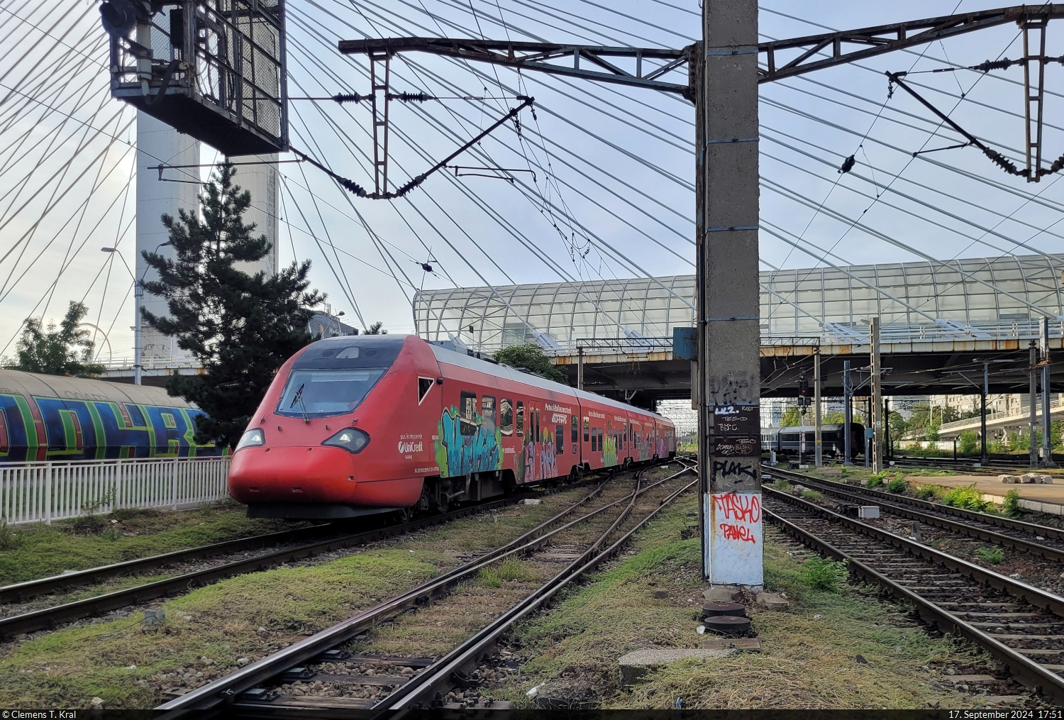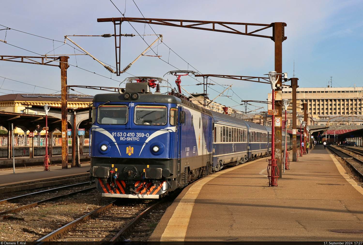 410 359-0 (91 53 0 410 359-0 RO-SNTFC) beschleunigt mit ihren Schnellzugwagen aus Gleis 9 des Startbahnhofs București Nord (RO).