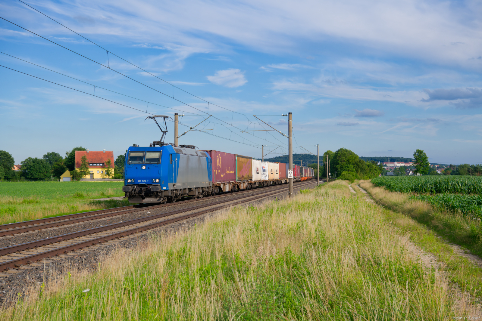 185 528 ATLU/TXL mit einem Containerzug bei Gunzenhausen Richtung Ansbach, 10.07.2021