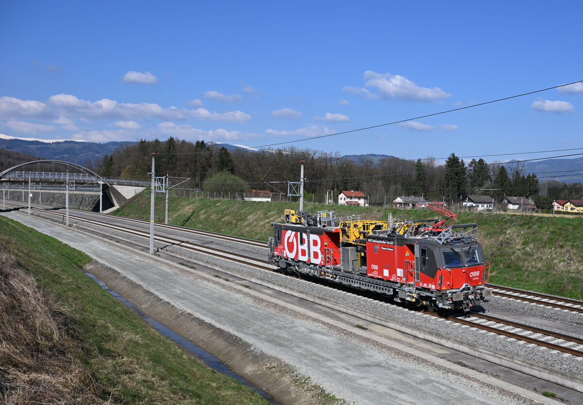 Der Plasser CatenaryCrafter 15.4 E³ X710.001 absolvierte am frühen Morgen des 3. April 2025 eine Fahrt in elektrischer Traktion von St.Paul im Lavanttal nach Graz Puntigam, hier zu sehen kurz vor dem Bahnhof Weststeiermark.