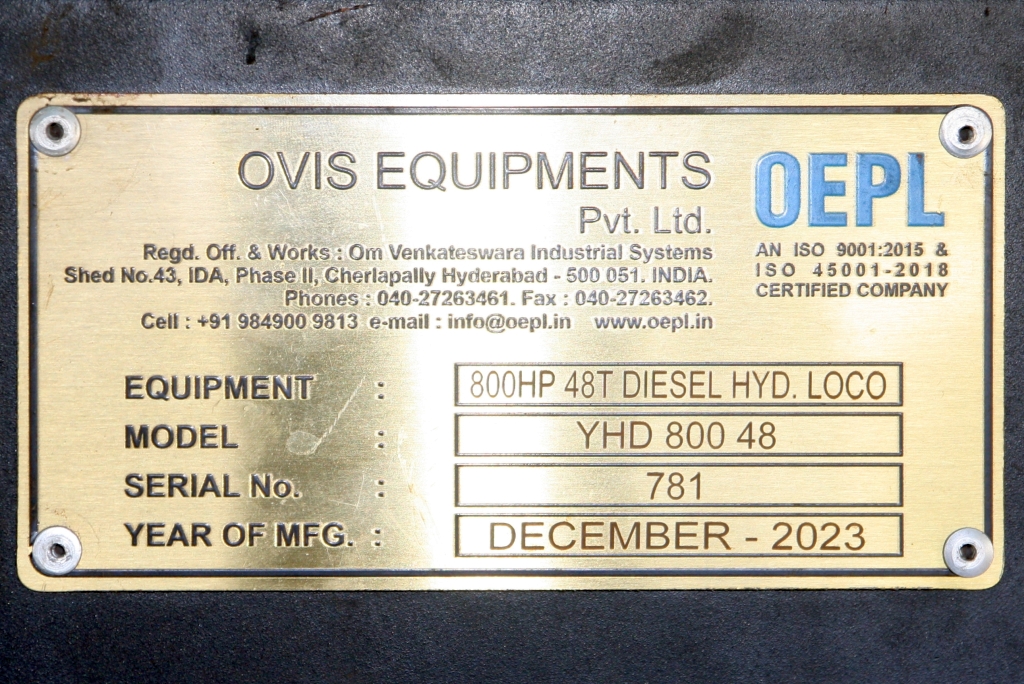 Fabrikschild der JKNS 7003 (Hersteller: OEPL, Ovis Equipments Private Ltd., Indien, Type: YHD 800 48, Baujahr 2023), aufgenommen am 15.Februar 2025 in der Stesen Tanjung Aru.