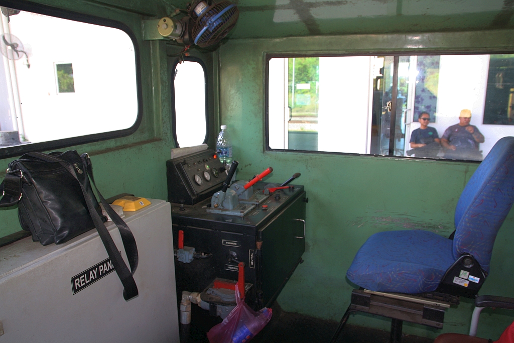 Führerstand der JKNS 7003 (Hersteller: OEPL, Ovis Equipments Private Ltd., Indien, Type: YHD 800 48, Baujahr 2023), aufgenommen am 15.Februar 2025 in der Stesen Tanjung Aru.