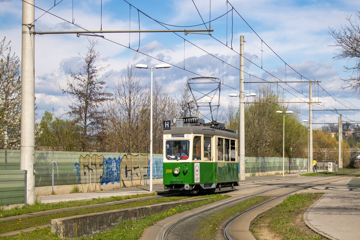 Graz. Am 05.04.2025 ist Triebwagen 206 auf Sonderfahrt als Linie H, hier bei der Haltestelle P+R Liebenau.
