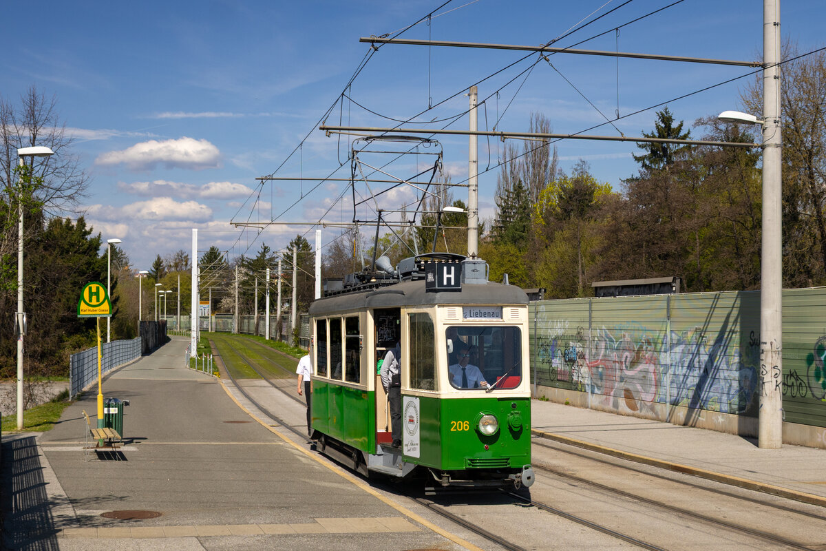 Graz. Am 05.04.2025 ist Triebwagen 206 auf Sonderfahrt als Linie H, hier bei der Haltestelle Karl-Huber-Gasse.