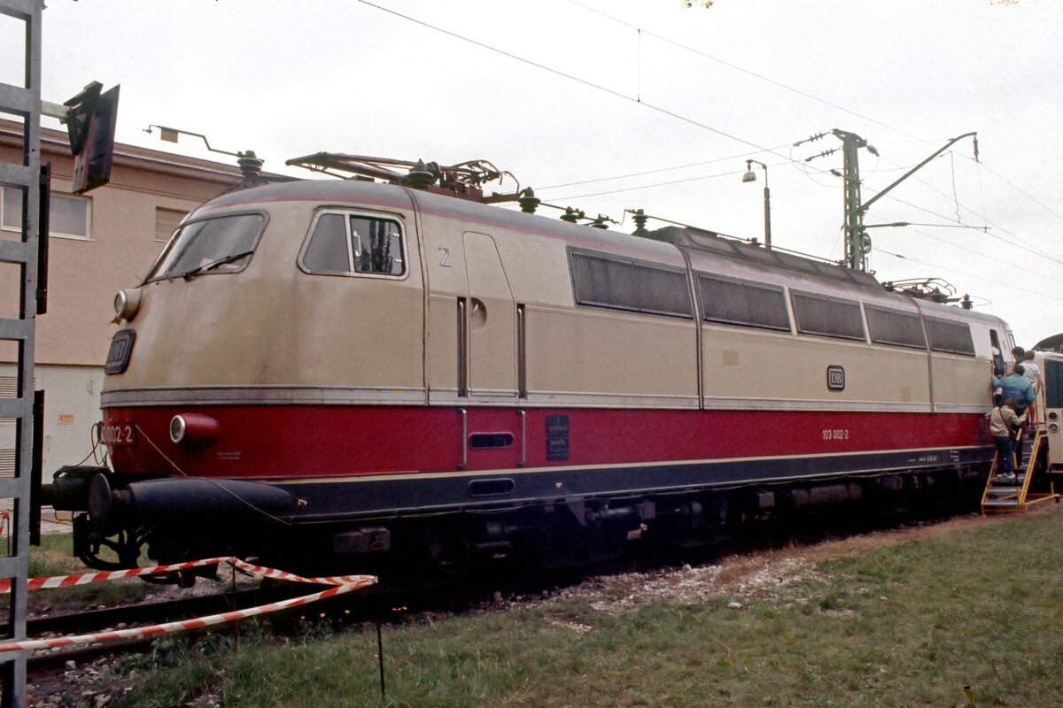Vorserienlok 103 002 am 26.06.1982 auf einer Fahrzeugausstellung im BZA München.