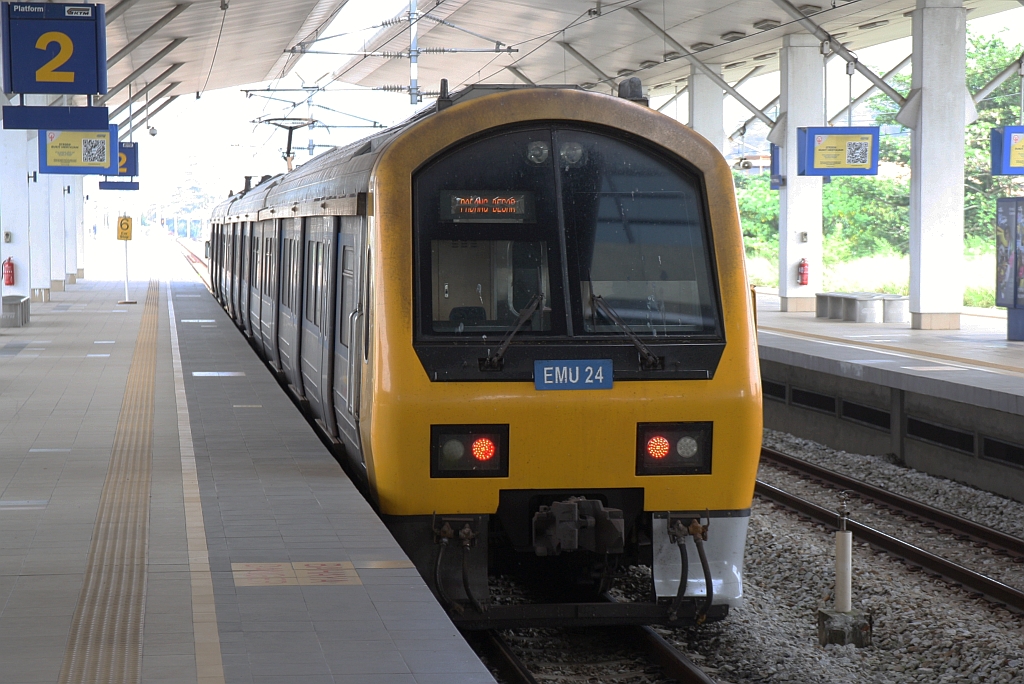 KTM Class 92, Garnitur SCS 20 (Bo′Bo′+2′2′+Bo′Bo′+Bo′Bo′+2′2′+Bo′Bo′, Hersteller: CSR Zhuzhou Electric Locomotive Co.Ltd., Baujahr: 2011) fährt am 17.Februar 2025 in die Stesen Bukit Mertajam ein.