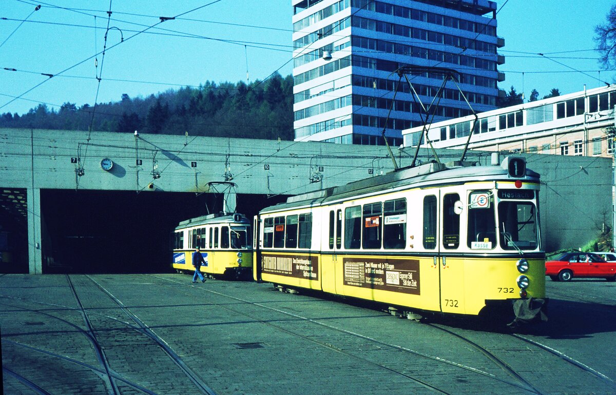SSB Stuttgart_Straßenbahn-Betriebshöfe__(Vh 9) Vogelrain/Heslach.__GT4 732 und BTw 606 auf Linie 1 rangieren vor der Wagenhalle.__08-04-1974