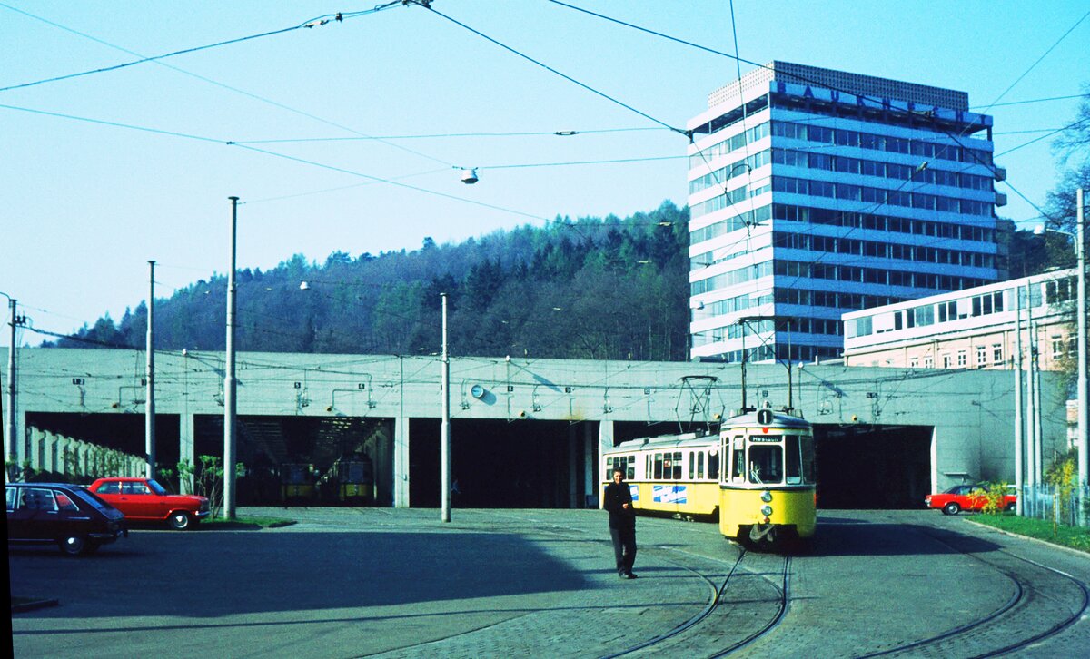 SSB Stuttgart_Straßenbahn-Betriebshöfe__(Vh 9) Vogelrain/Heslach.__Nach dem Frühverkehr: GT4 als BTw auf Linie 15 rückt rückwärts ein ins Depot.__08-04-1974