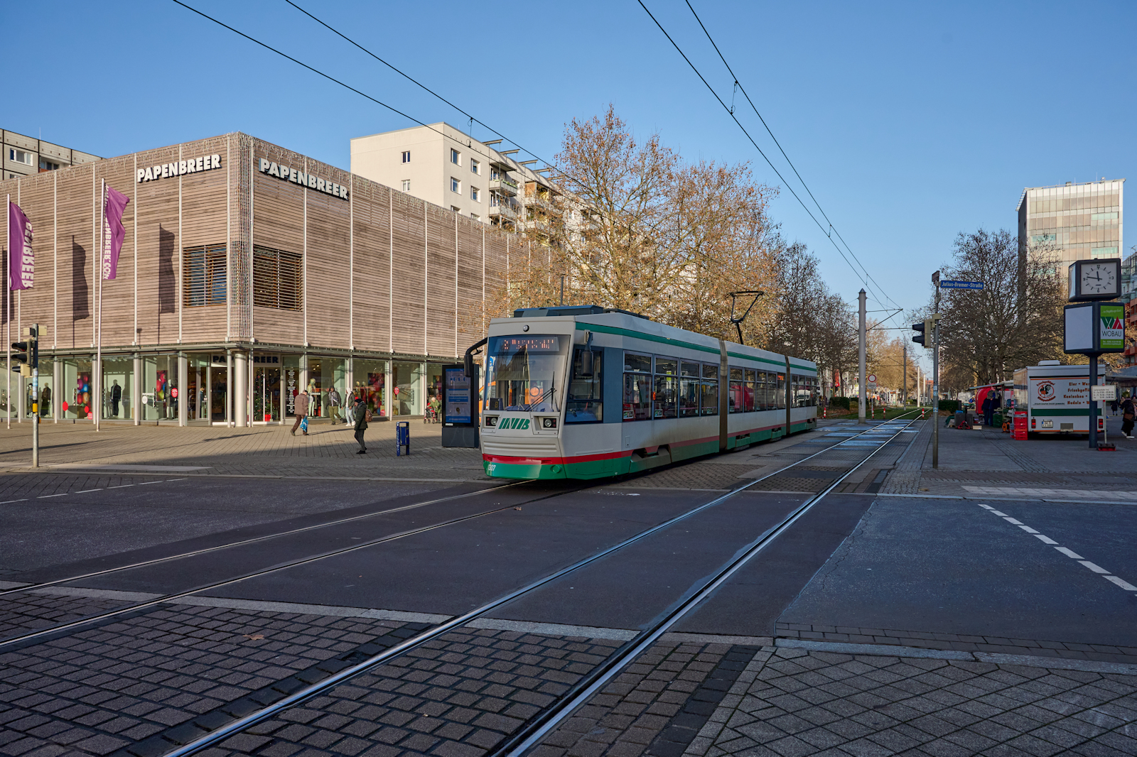 Am 20.12.2024 war Wagen 1307 der Magdeburger Verkehrsbetriebe auf der Linie 2 in Richtung Westerhüsen unterwegs. In Kürze wird die Haltestelle Alter Markt erreicht.
