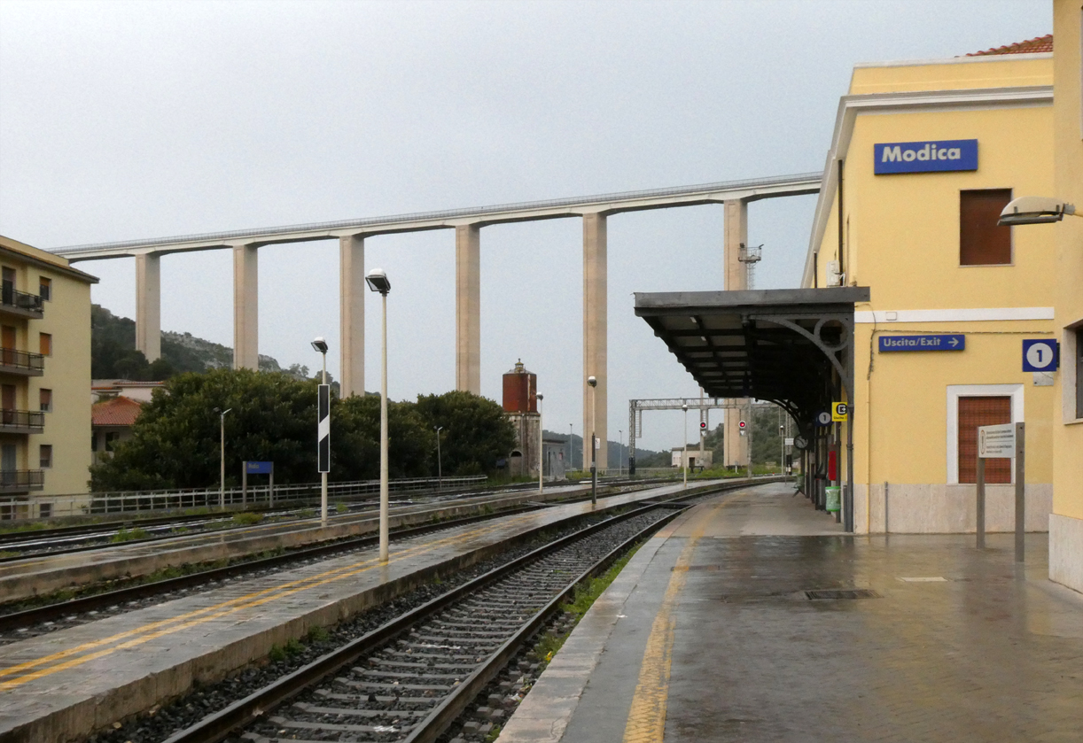 Kopfbahnhof in Modica in der Region Ragusa: während unseres Kurzaufenthaltes verkehrte leider kein Zug, dafür ist im Hintergrund die imposante Strassenbrücke Ponte Guerrieri zu sehen. Modica, 31.3.2025