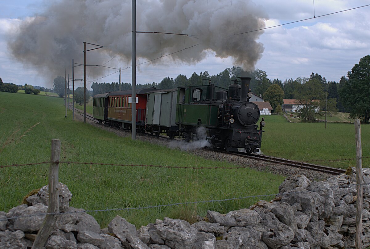 CJ Chemins de fer du Jura La Traction: G 3/4 14 "Madlaina" + J 316 + WR 777 + BR 779, Zug Bollement-Saignelégier, private Veranstaltung mit Verpflegung und Zugüberfall, Les Communances, 23. August 2025.