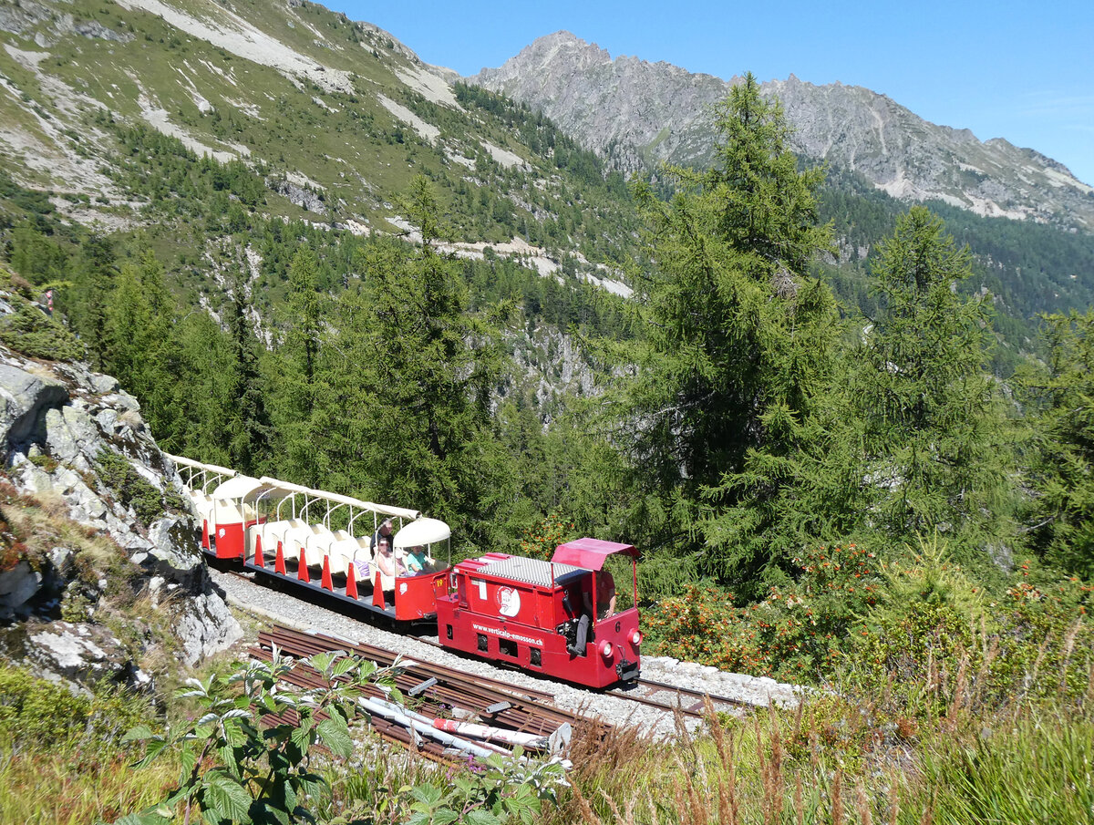 Der Panoramazug hat die Station Les Montuires auf 1821 müM verlassen und fährt mit den offenen Wagen in Richtung Stausee Lac d'Emosson. Les Montuires, 25.8.2025