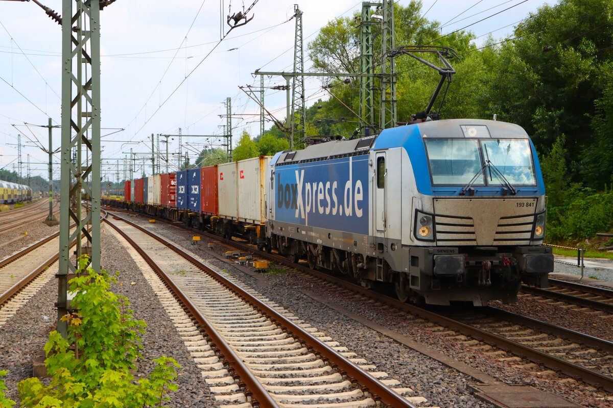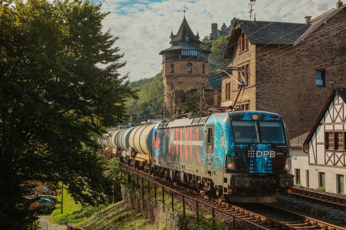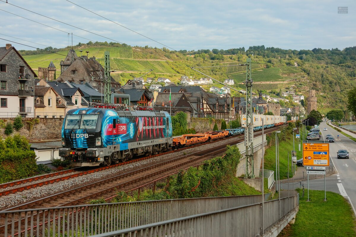 193 636 Beacon mit Containerzug in Oberwesel, August 2025.
